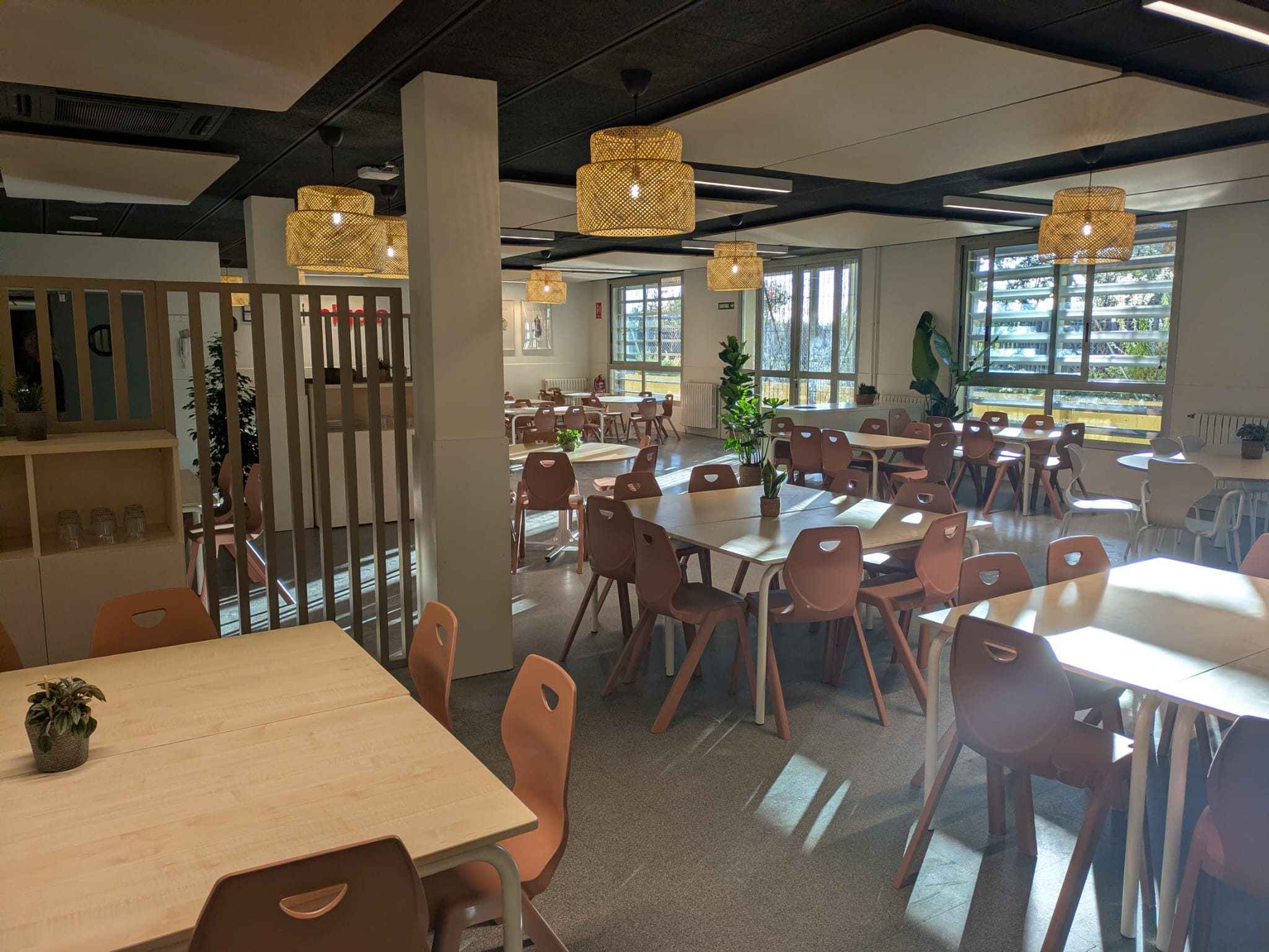 Pel que fa a l’espai físic, s’ha iniciat la renovació arquitectònica d’onze menjadors amb actuacions que han inclòs millores en la insonorització, redistribucioms de l’espai, canvis de pintura per apostar pels tons càlids, il·luminació LED, nou mobiliari adaptat, panells fonoabsorbents i estructures que afavoreixen autonomia i regulació emocional.