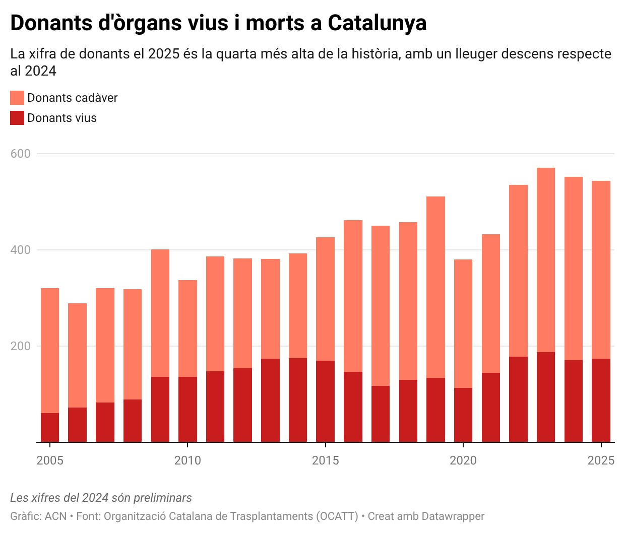 ACN Barcelona – Catalunya va fer 1.356 trasplantaments d’òrgans el 2025, un 0,8% més que el 2024 (1.345) i la segona millor xifra de la història, segons el balanç de l’Organització Catalana de Trasplantaments (OCATT). La millor dada es va donar el 2023 (1.393). La majoria dels trasplantaments del 2025 van ser renals, amb un total de 945 i un increment del 3,6% respecte del 2024; seguits dels hepàtics, amb 206 (-8%); els cardíacs, amb 68 (+4,6%); els pulmonars, amb 110 (+4,8%); i els pancreàtics, amb 27 (-30,8%). Pel que fa als donants, hi va haver 370 cadàvers (-2,9%) i 174 vius (+1,8%). L’OCATT ha alertat que les negatives familiars a la donació continuen pujant, fins a situar-se en el 27,6% del total de les entrevistes familiars fetes l’any passat.