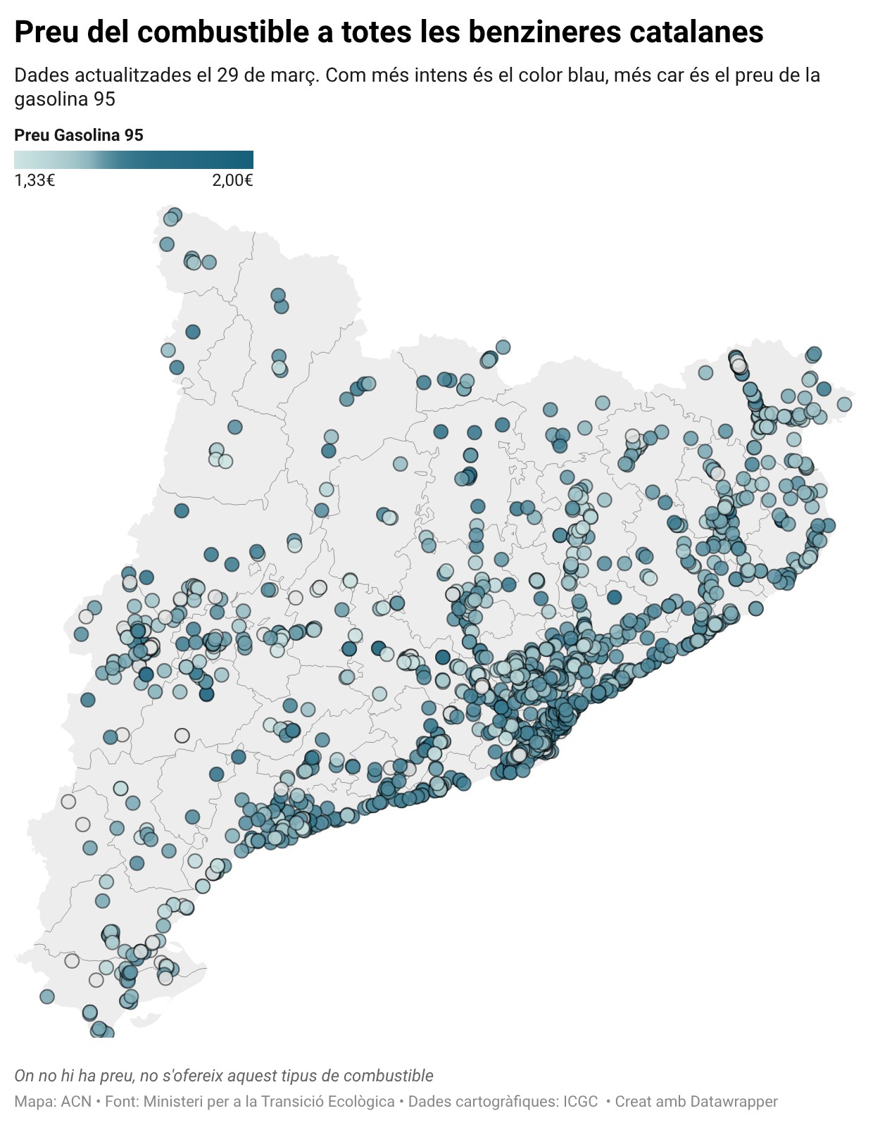 Els dos combustibles han vist els preus pràcticament congelar-se els últims set dies, d’ençà de la baixada provocada per la reducció de l’IVA. Amb l’estabilització de les últimes jornades, ja no hi ha cap benzinera a Catalunya on el sense plom 95 passi dels 2 euros, i només una al municipi de Montseny arriba als 1,99. La segueixen un grup que l’ofereixen a un preu que oscil·la entre els 1,75 i els 1,80 euros. Pel que fa al dièsel, només una, a Calders, arriba a 2,01, mentre que la resta de benzineres més cares se situen en els 1,90 euros aproximadament.