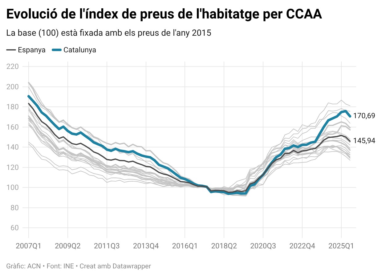 En aquesta estadística, Catalunya se situa amb el tercer índex de preus més alt d’Espanya, amb 170,69 punts el tercer trimestre del 2025. Només Navarra (181) i l’Aragó (176,6) tenen un índex superior. Pel que fa al comportament dels preus el darrer any, Catalunya ha registrat un increment d’11,3 punts en el seu índex respecte a un any enrere, l’increment més alt d’aquesta comunitat en tota la sèrie històrica.