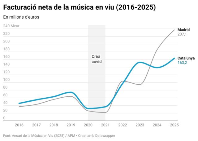 ACN Barcelona – Barcelona – La música en viu va experimentar un augment d’un 17,7% en la facturació per venda d’entrades l’any 2025 a Catalunya, dels 138,5 milions de l’any anterior fins als 163,2 milions d’euros. És una xifra rècord per un sector que l’any 2024 havia reculat un 9%, cedint la primera posició a la Comunitat de Madrid, impulsada al seu torn per les grans gires internacionals que passen per la capital espanyola. De fet, Madrid torna a situar-se enguany en el primer lloc de les autonomies amb més facturació, amb 237,1 milions d’euros, un 28,1% més que l’assolida el 2024. El Primavera Sound va tornar a ser el segon macrofestival estatal amb més públic, 297.000 assistents, per darrere dels 300.000 que va aplegar l’Arenal Sound (Borriana).