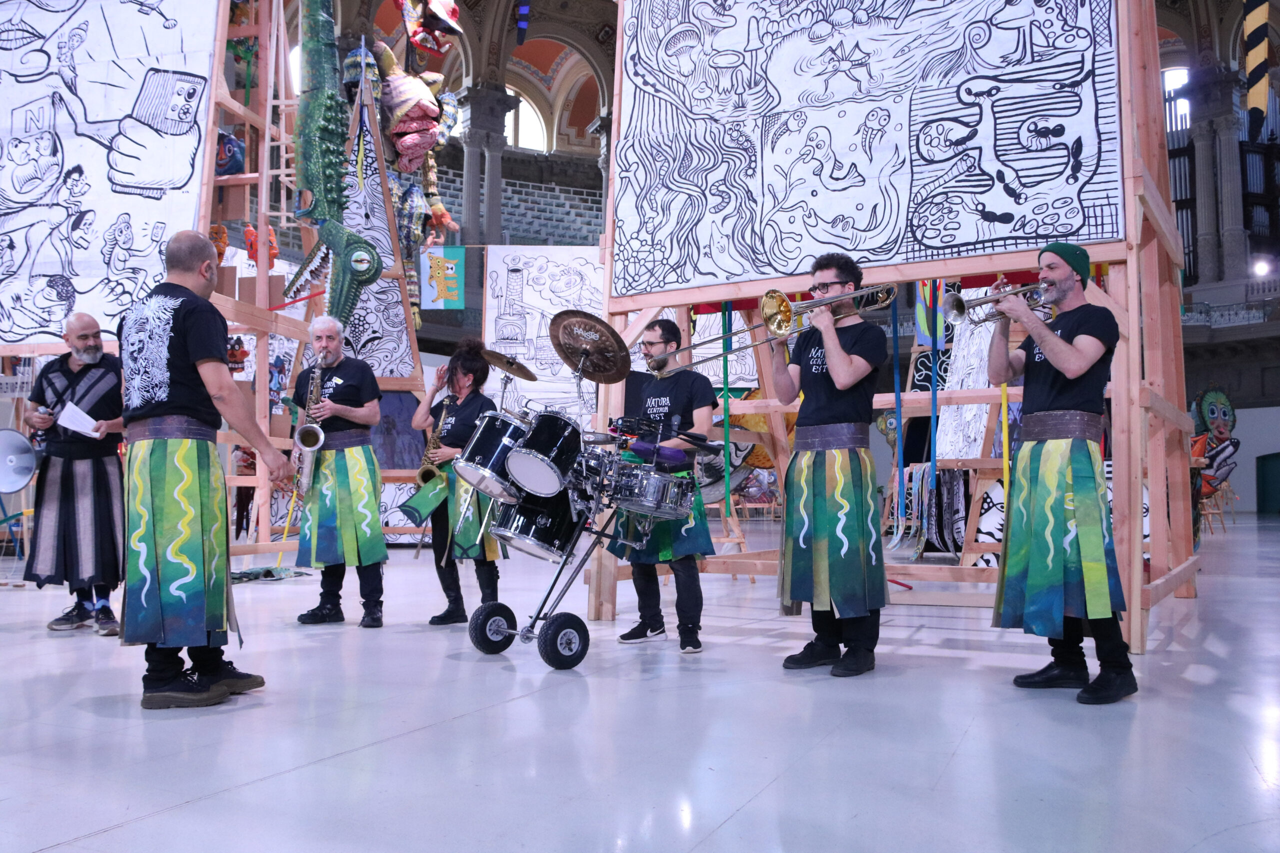 ‘Natura Centrum Est’ es configura com un campament pel qual el visitant podrà deambular a través de telons i objectes —cartells, figures de gran format, dibuixos i pancartes— construïts per una desena de col·lectius, entre els quals hi ha associacions de veïns, grups de folklore, escoles d’art i persones vulnerables. Per això, l’autor reivindica que la mostra “ha estat concebuda com una obra una compartida”, malgrat que l’origen de cadascuna de les peces no fos aquest.