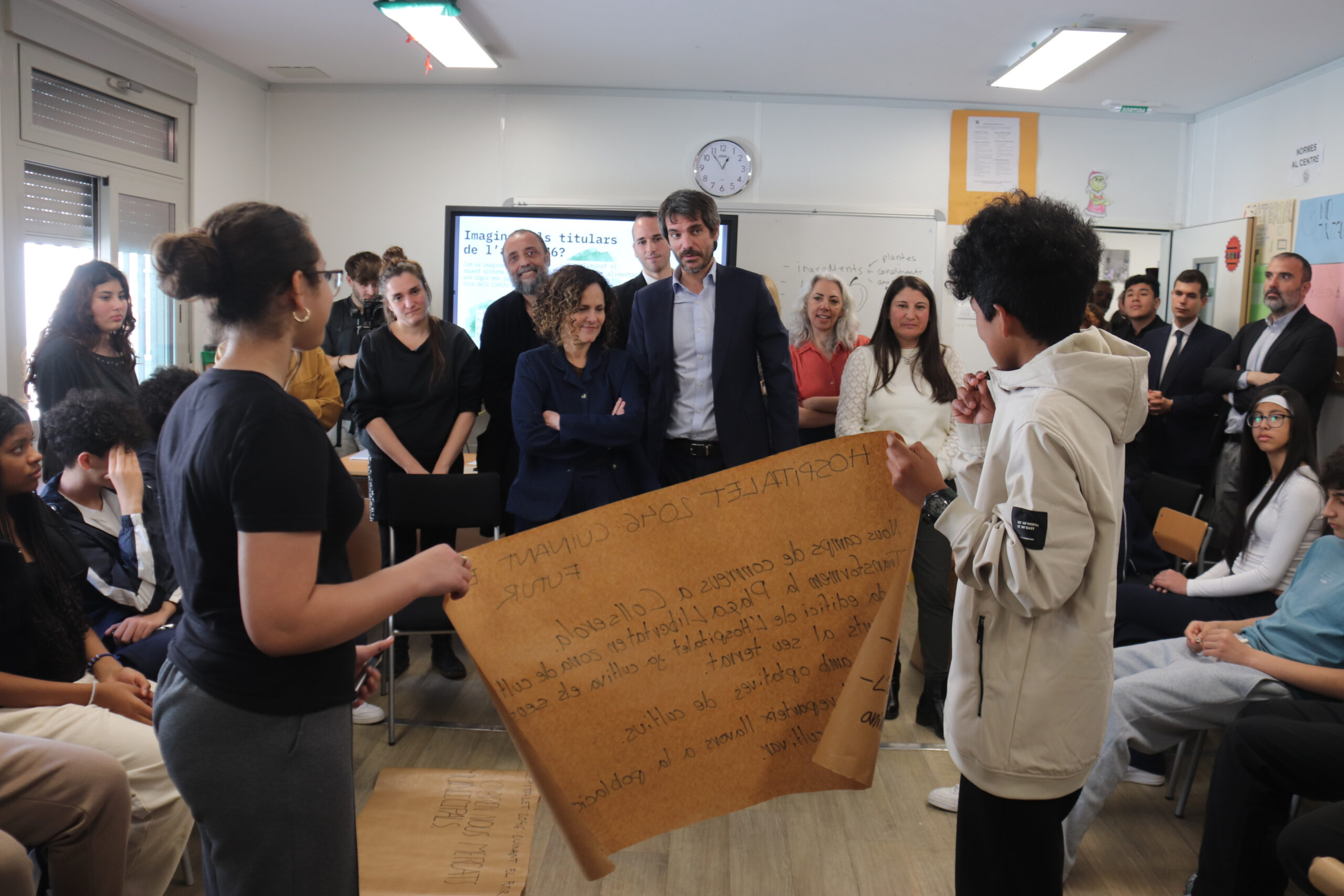 Durant la visita, Urtasun ha explicat que el projecte parteix de la recollida de receptes del barri per part dels alumnes, en un entorn marcat per la diversitat d’orígens de les famílies. A partir d’aquest material, els estudiants treballen a l’aula creacions artístiques que després exposaran al mercat municipal.