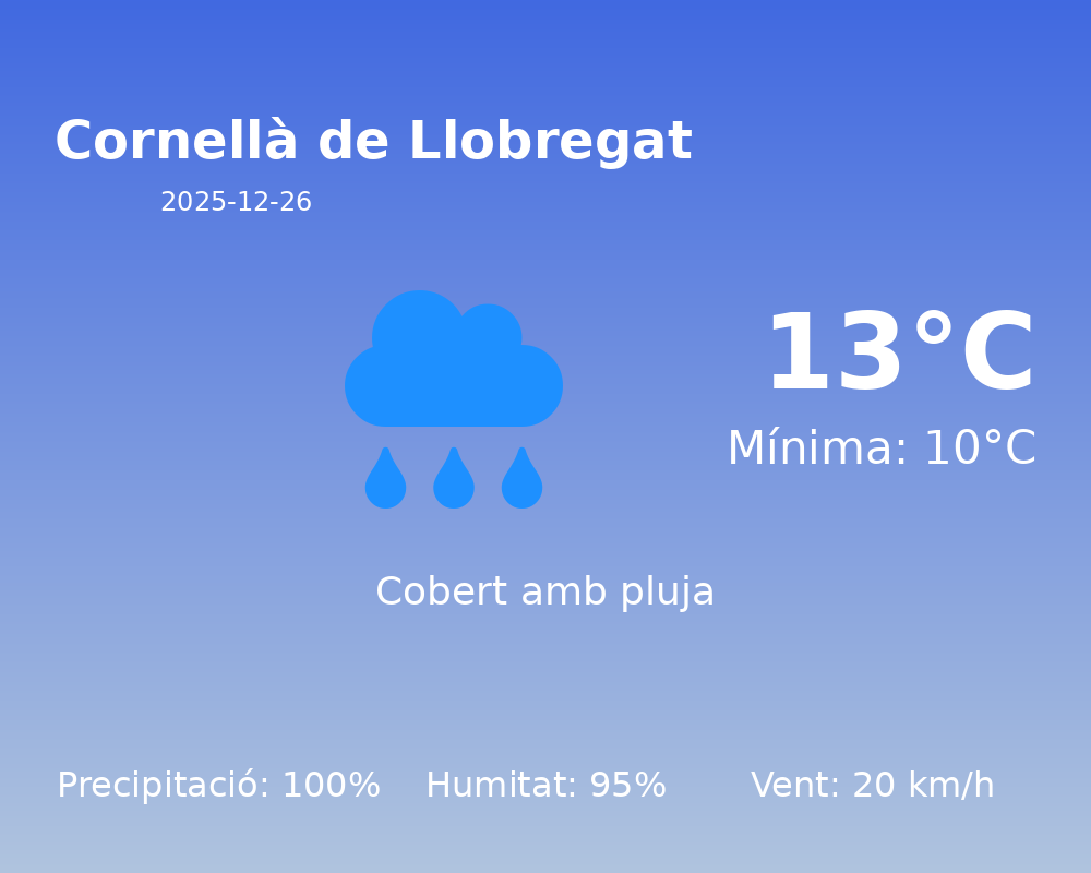 En resum, el 26 de desembre a Cornellà de Llobregat es presenta com un dia de condicions inestables i humides. Caldrà ser precaució en els desplaçaments, especialment si es condueix, atenent a la visibilitat reduïda i les carreteres mullades.